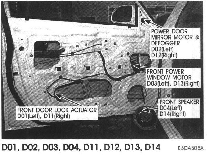 D01 Left Front Door Lock Actuator, D02 Left Power Door Mirror Motor & Defogger, D03 Left Front Power Window Motor, D04 Left Front Speaker, D11 Right Front Door Lock Actuator, D12 Right Power Door Mirror Motor & Defogger, D13 Right Front Power Window Moto: