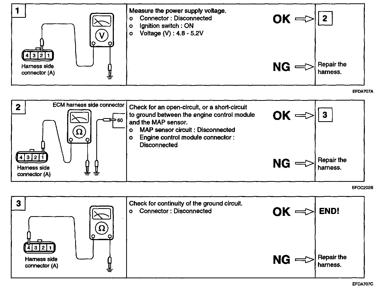 1. Measure the voltage between terminals 1 and 4 of the MAP sensor connectors.