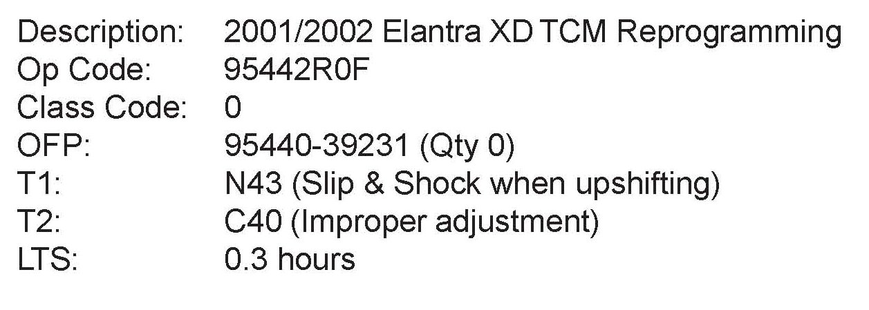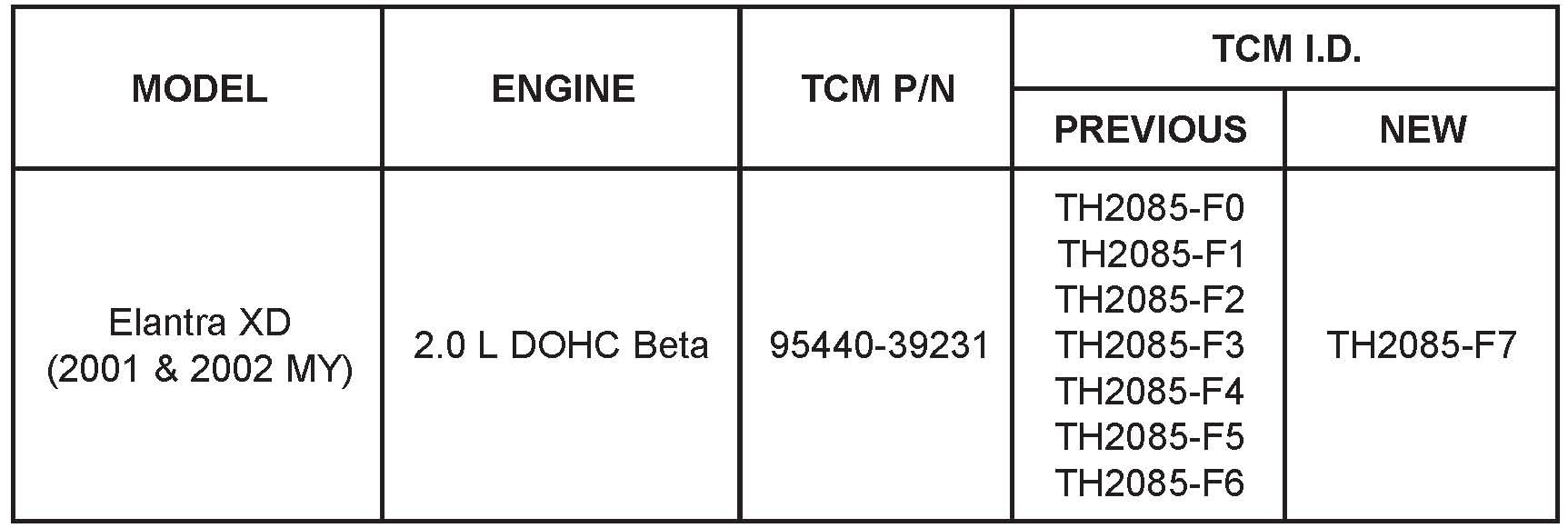 This bulletin is issued to inform you of a Transaxle Control Module (TCM) reprogramming procedure for certain 2001 & 2002 MY 2.0 litre Elantra XD vehicles (as specified below) that may experience a shift flare when the Automatic Transaxle changes from second to third gear (2~3).