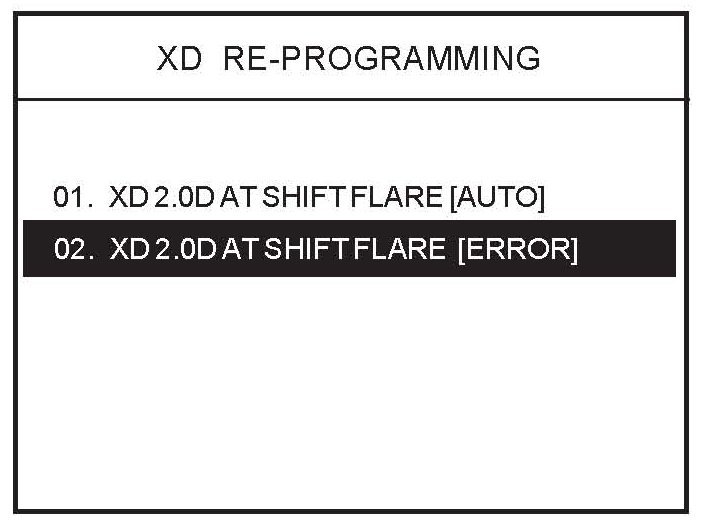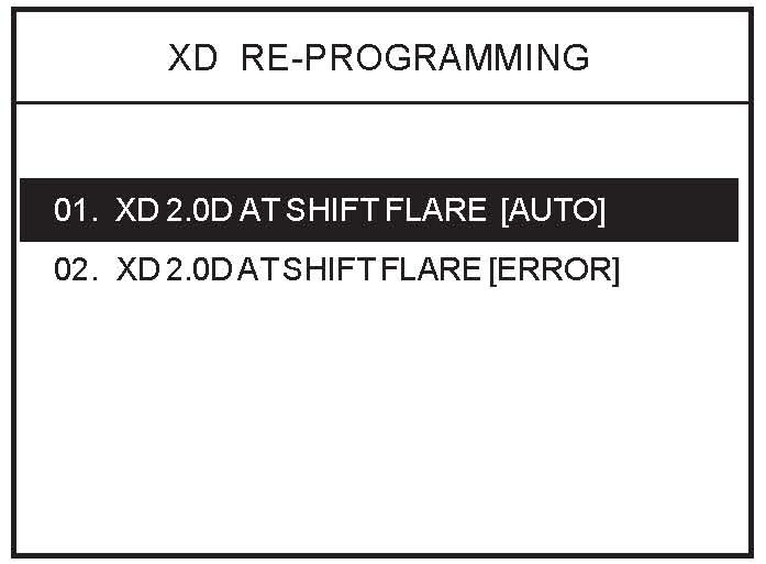 In the event menu option "01. XD 2.0D AT SHIFT FLARE [AUTO]" fails to download the new TOM program, option "02. XD 2.0D AT SHIFT FLARE [ERROR]" must be used.