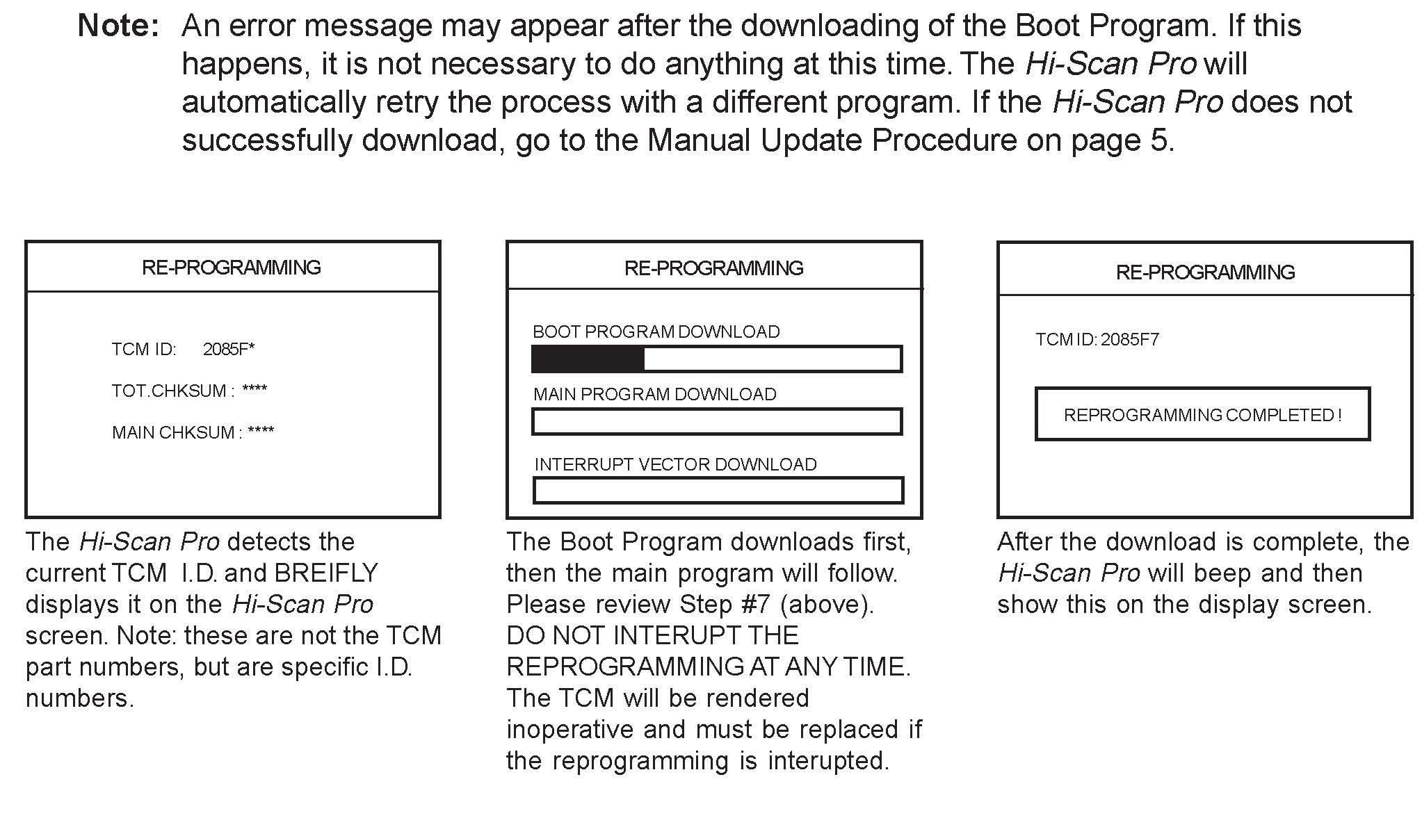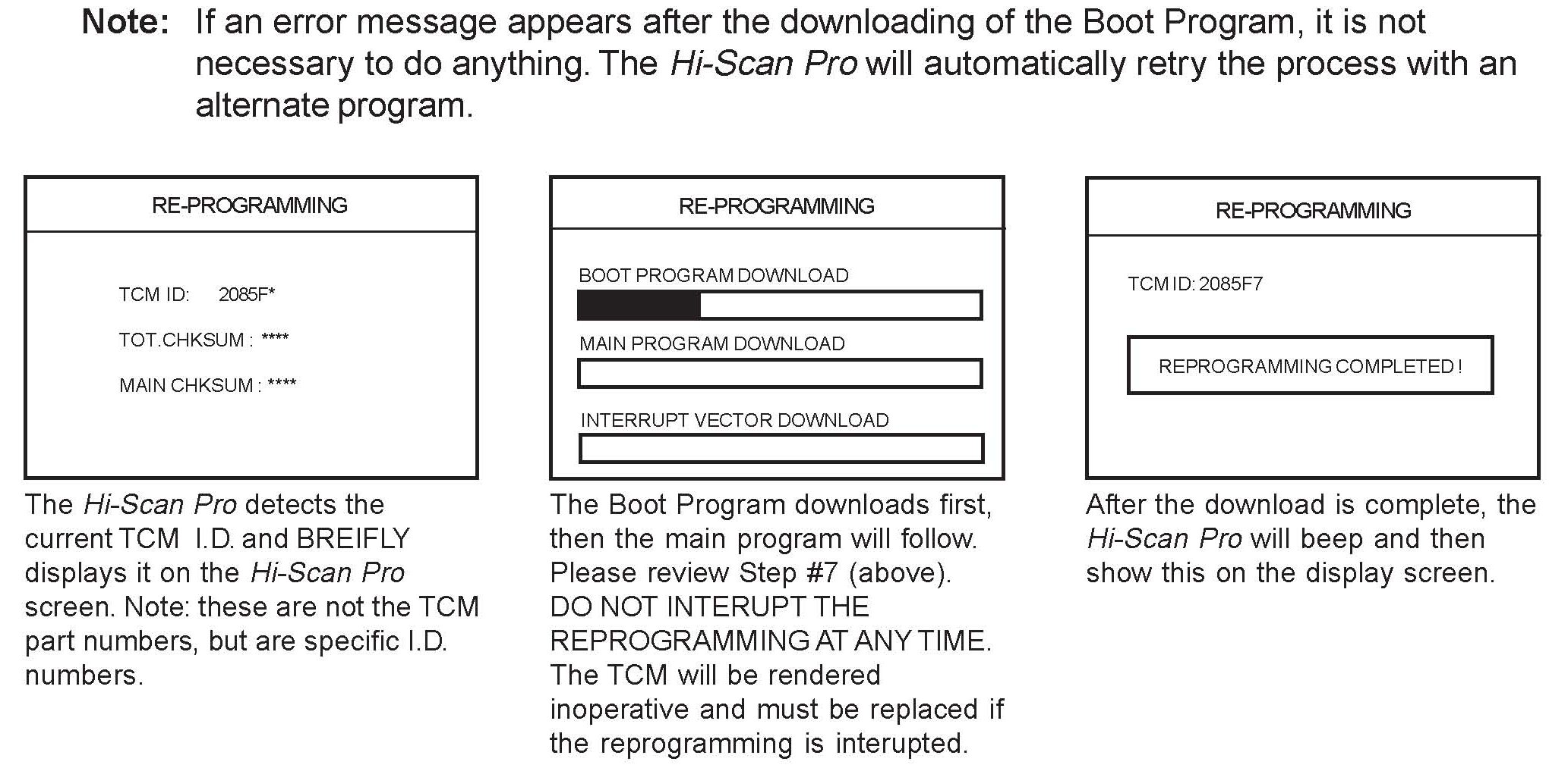 2. REPROGRAMMING ERROR PLEASE WAIT FOR RETRY: An error occurred during reprogramming. The Hi-Scan Pro will retry reprogramming automatically.