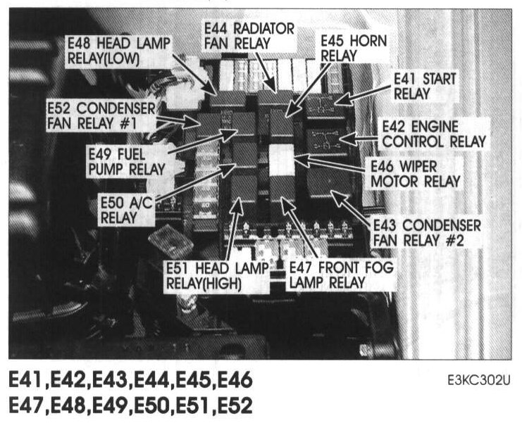 E48 Head Lamp Relay(Low), E44 Radiator Fan Relay, E45 Horn Relay, E41 Start Relay, E42 Engine Control Relay, E46 Wiper Motor Relay, E43 Condenser Fan Relay #2, E47 Front Fog Lamp Relay, E51 Head Lamp Relay (High), E50 A/C Relay, E49 Fuel Pump Relay, E52: