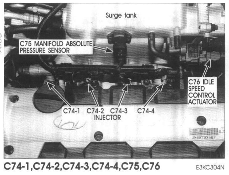 C74-1(#1), 2(#2), 3(#3), 4(#4) Injector, C75 Manifold Absolute Pressure Sensor, C76 Idle Speed Control Actuator: