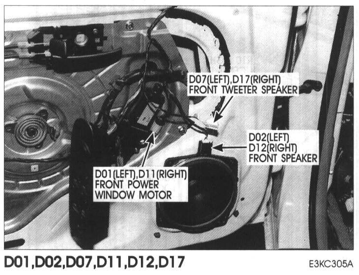 D01(Left), D11(Right) Front Power Window Motor, D02(Left), D12(Right) Front Speaker, D07(Left), D17(Right) Front Tweeter Speaker: