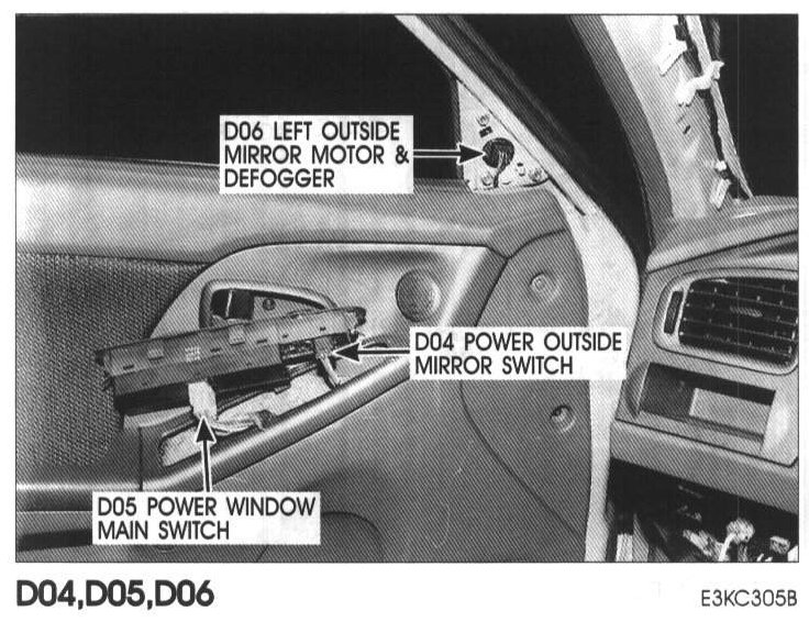 D04 Power Outside Mirror Switch, D05 Power Window Main Switch, D06 Left Outside Mirror Motor & Defogger: