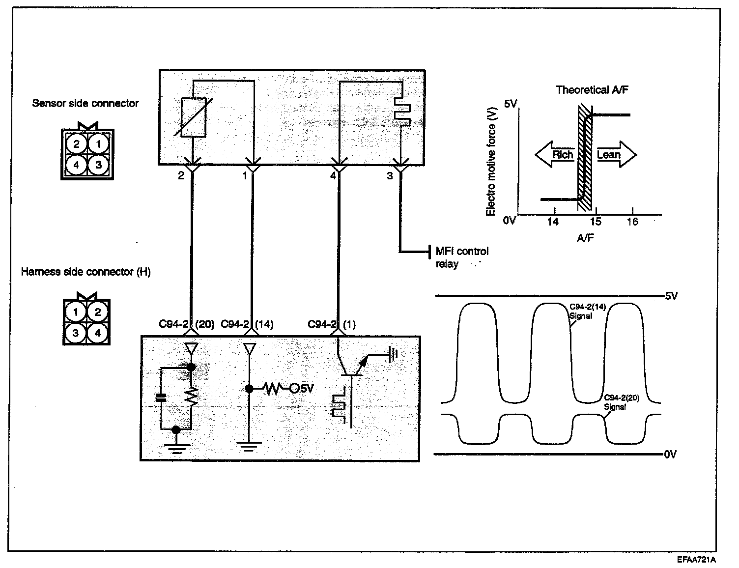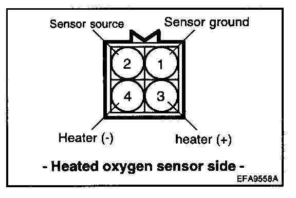 HEATED OXYGEN SENSOR (HO2S)The heated oxygen sensor senses the oxygen concentration in exhaust gas, converts it into a voltage, which is sent to the ECM. The oxygen sensor outputs about 0 V when the air fuel ratio is richer than the theoretical ratio, and outputs about 5 V when the ratio is leaner (higher oxygen concentration in exhaust gas.). The ECM controls the fuel injection ratio based on this signal so that the air fuel ratio is maintained at the theoretical ratio. The oxygen sensor has a heater element which ensures the sensor performance during all driving conditions.