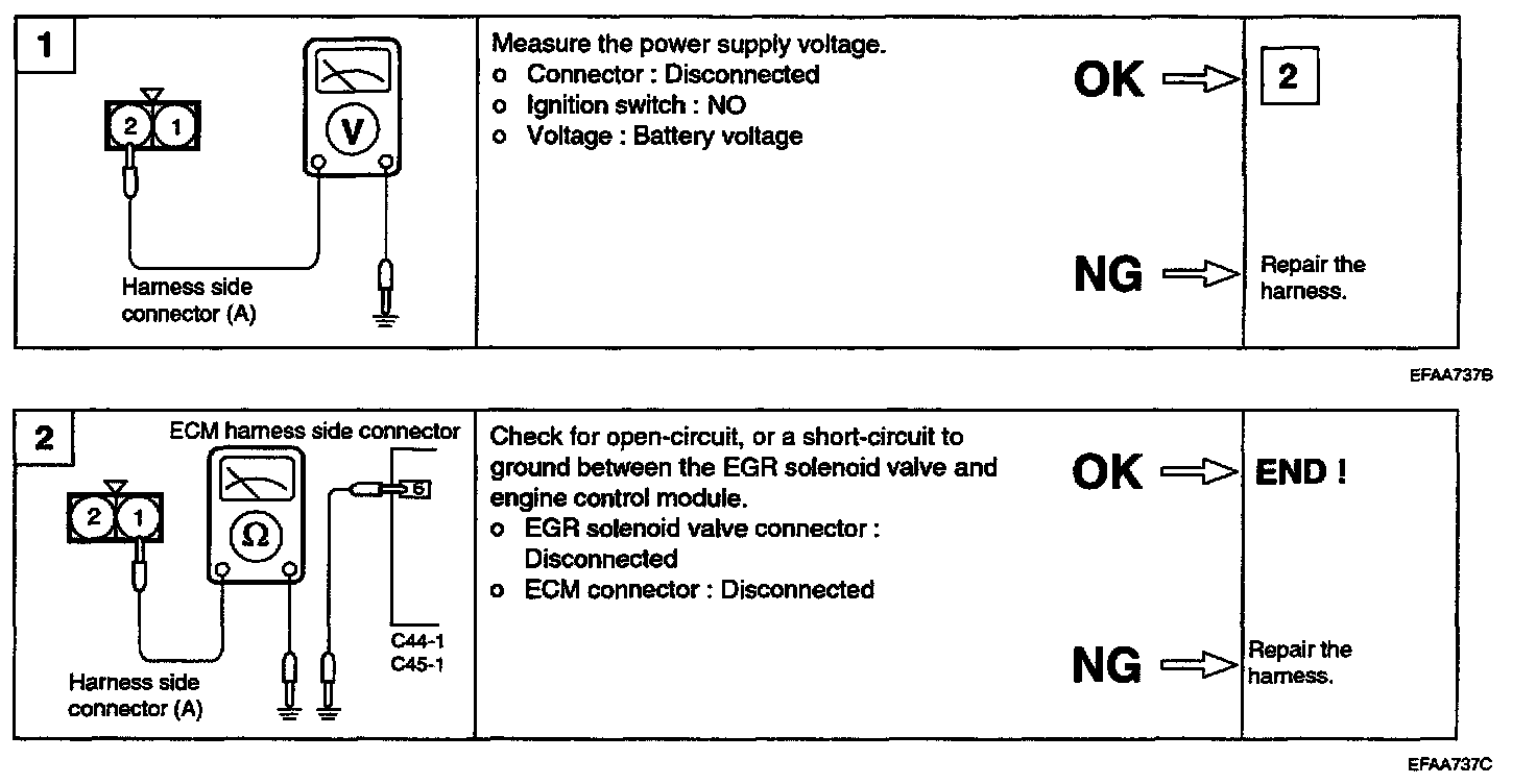 If the results of EGR solenoid valve on-vehicle and off vehicle inspections are normal, but the diagnostic trouble code for EGR system failure is displayed, check the EGR valve, vacuum hose and EGR passage for blocking.