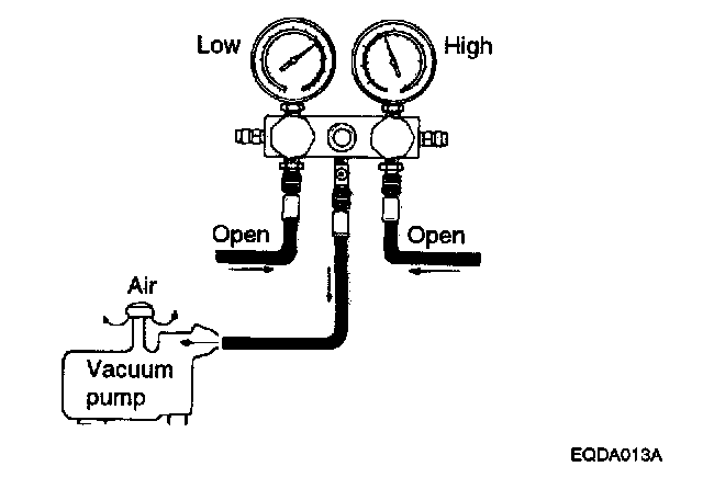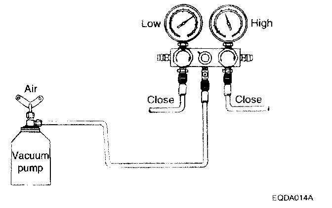 6. After about ten minutes, check that the low pressure gauge reads more than 94,39 kPa (0.96 kg. sq.cm, 13.7 psi) of vacuum. If negative pressure can not be obtained, there is a leak in the system. In this case, repair the leak as follows: