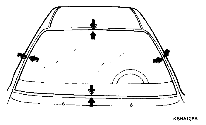4. Center a new windshield glass in the opening. Mark the location by marking lines across the glass and body with a grease pencil at the four points as shown.