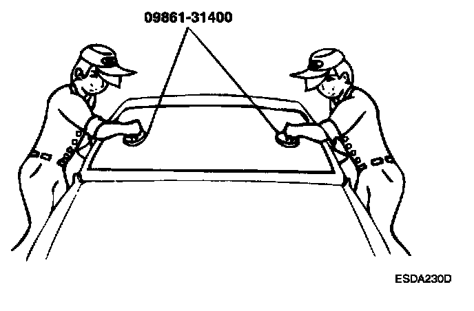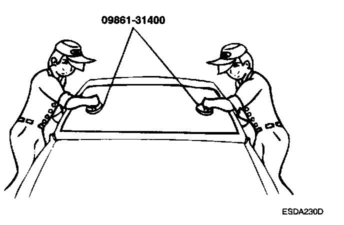 11. Using suction cups or the special tool (09861-31400), lower the glass over the opening, align it with the marks made in step 4 and set it down on the sealant.