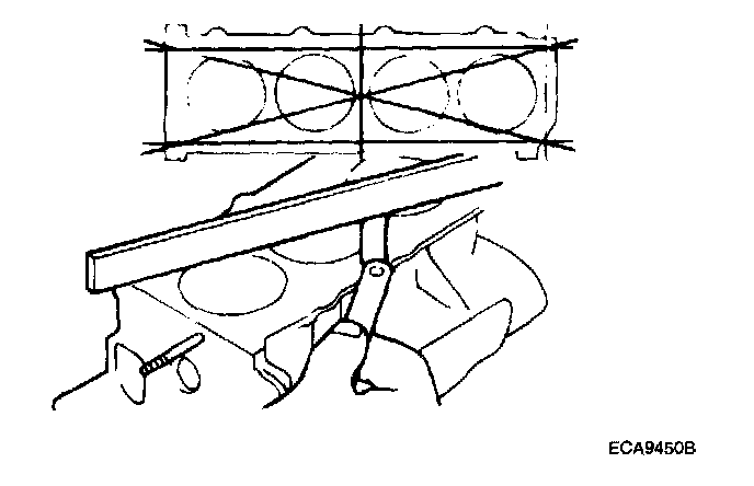 2. Using a straight edge and feeler gauge, check the top surface of the block for warpage. Make sure that the surface is free from gasket chips or other foreign material.