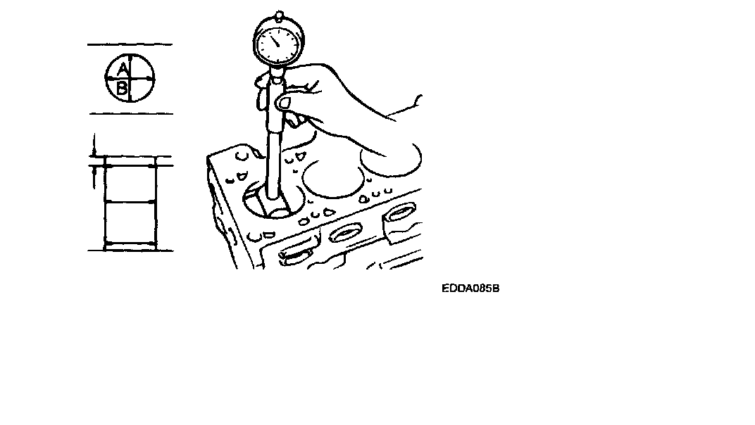 3. Measure the cylinder bore with a cylinder gauge at three levels in the direction of A and B. If the cylinder bores show more than the specified out-of-round or taper or if the cylinder walls are badly scuffed or scored, the cylinder block should be rebored and honed. Oversize pistons and rings must be fitted.