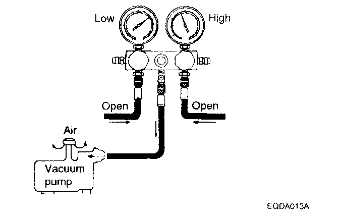 1. Connect the manifold gauge set to the system.2. Put a towel under the open end of the center hose.