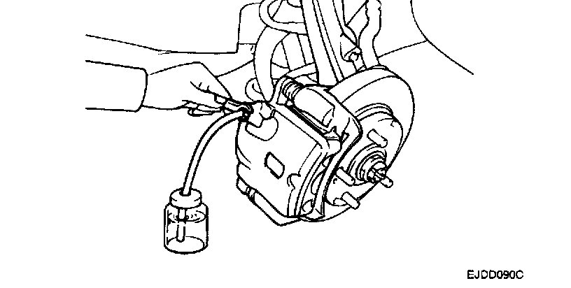 4. While depressing the brake pedal fully, loosen the bleeder plug until the fluid starts to run out. Then close the bleeder plug.