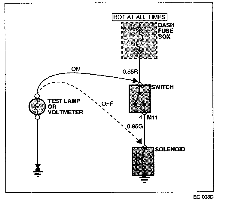 A. Connect one lead of a test lamp or voltmeter to a ground. If you are using a voltmeter, be sure it is the voltmeter's negative test lead you have connected to ground.