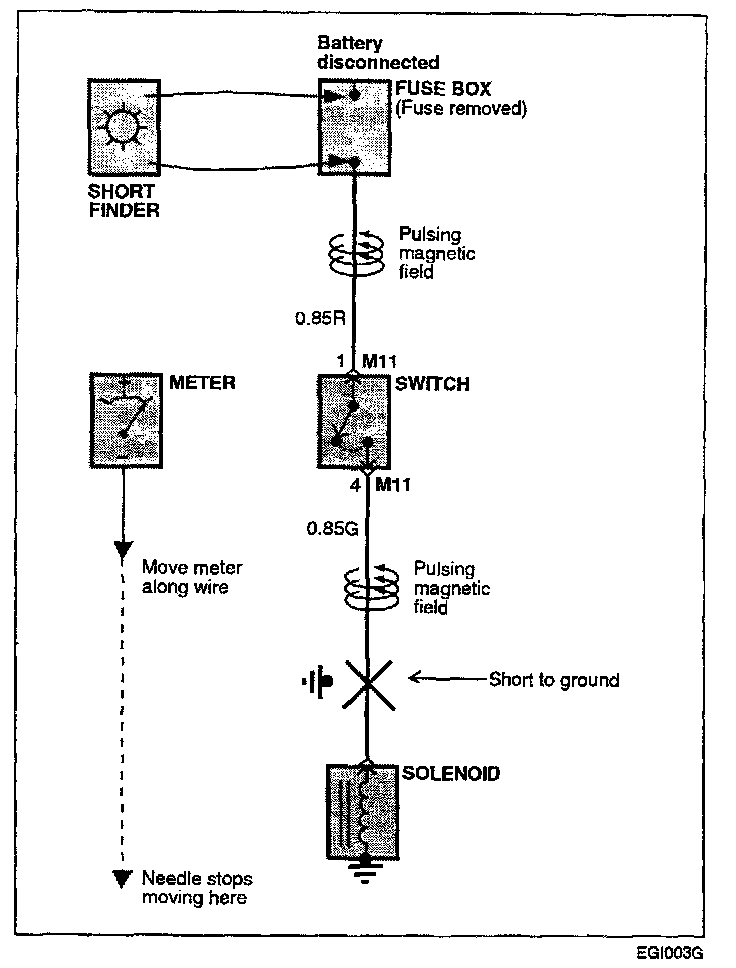 E. Beginning at the fuse box, slowly move the short finder along the circuit wiring. The meter will show current pulses through sheet metal and body trim. As long as the meter is between the fuse and the short, the needle will move with each current pulse. Once the meter is moved past the point of the short, the needle will stop moving. Check around this area to locate the cause of the short circuit.