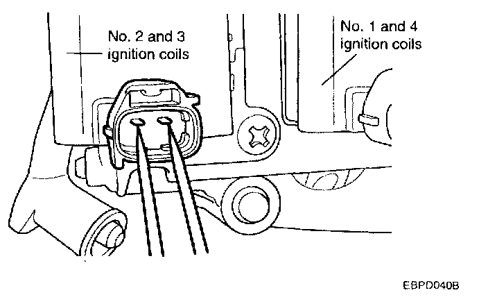 2. Measure the secondary coil resistance between the high-voltage terminal for the No.1 and No.4 cylinders, and between the high-voltage terminals for the No.2 and No.3 cylinders.