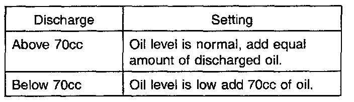 3. Check the amount of the discharged oil. If it is less than 70 cc, it means there is a little leak of oil. Perform the leakage test on each system connection, and repair or replace faulty parts if necessary.