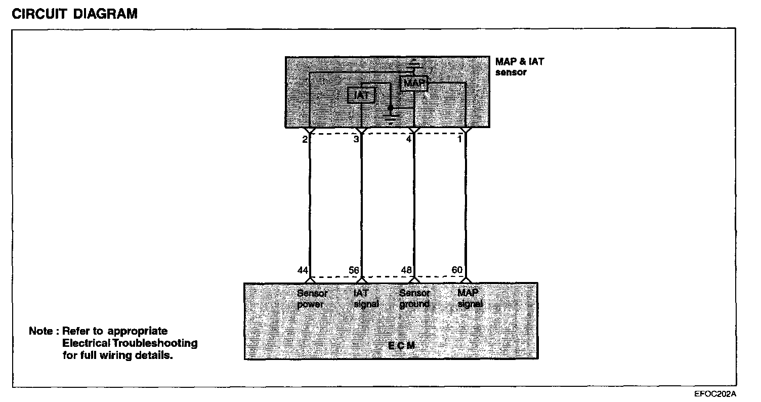 The intake air temperature sensor (IAT Sensor), built in to the MAP sensor, is a resistor-based sensor that detects the intake air temperature. According to the intake air temperature information from the sensor, the ECM will control the necessary amount of fuel injection.