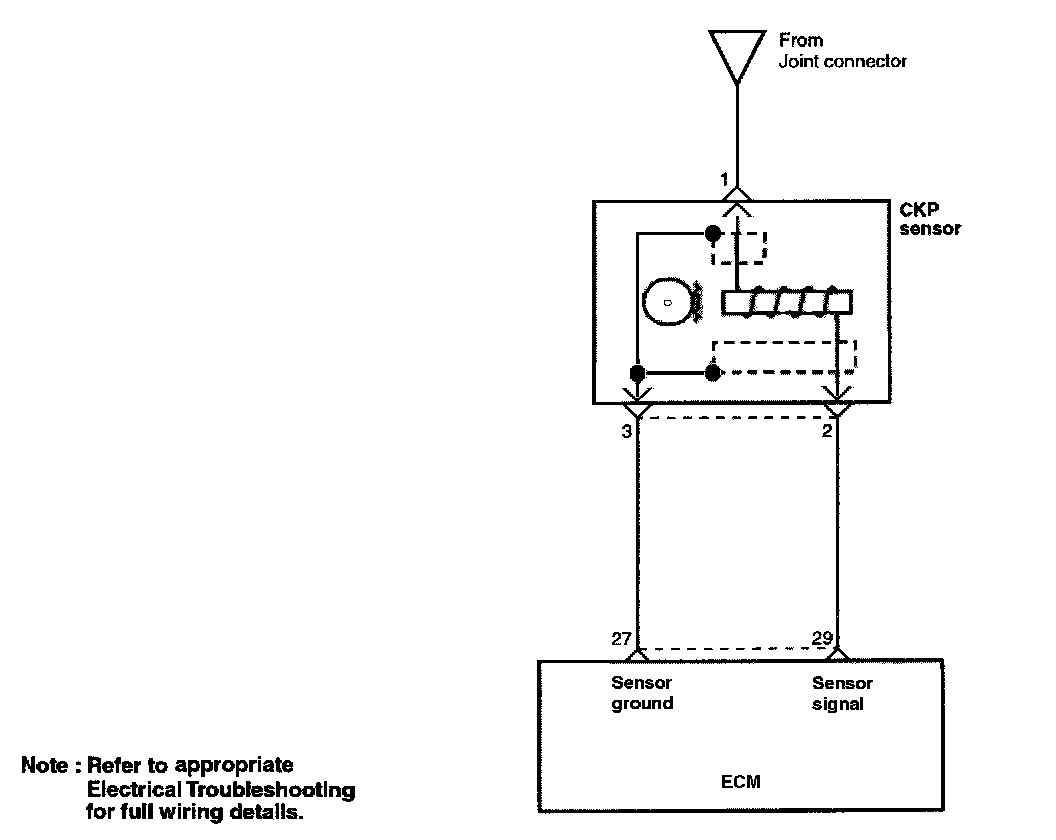 The voltage signal from this crankshaft position sensor is relayed to the ECM to indicate engine RPM and the position of the crankshaft.