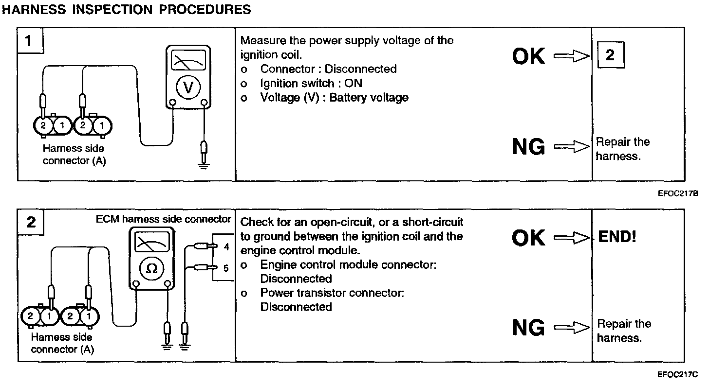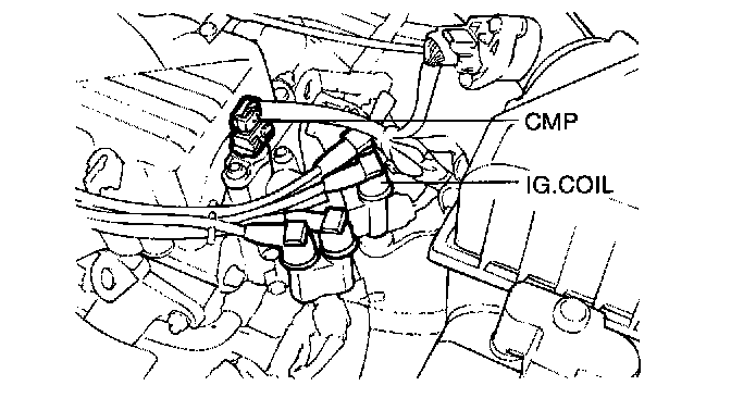 When the ignition power transistor is turned ON by a signal from the ECM, the ECM sends a signal to the ignition coil, then the primary current is shut off and a high voltage is induced in the secondary coil.