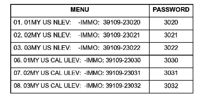 6. Select the correct password for the manual update mode which is correct for the vehicle specification by referring to the chart. Then press ENTER.