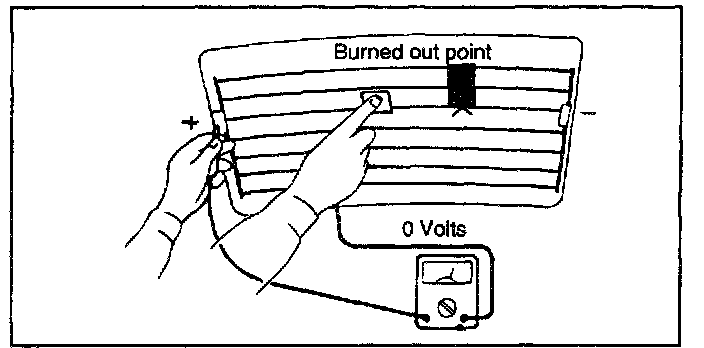 5. Use an ohmmeter to measure the resistance of each heater line between a terminal and the center of a grid line, and between the same terminal and the center of one adjacent heater line. The section with a broken heater line will have a resistance twice as that in other sections. In the affected section, move the test lead to a position where the resistance sharply changes.
