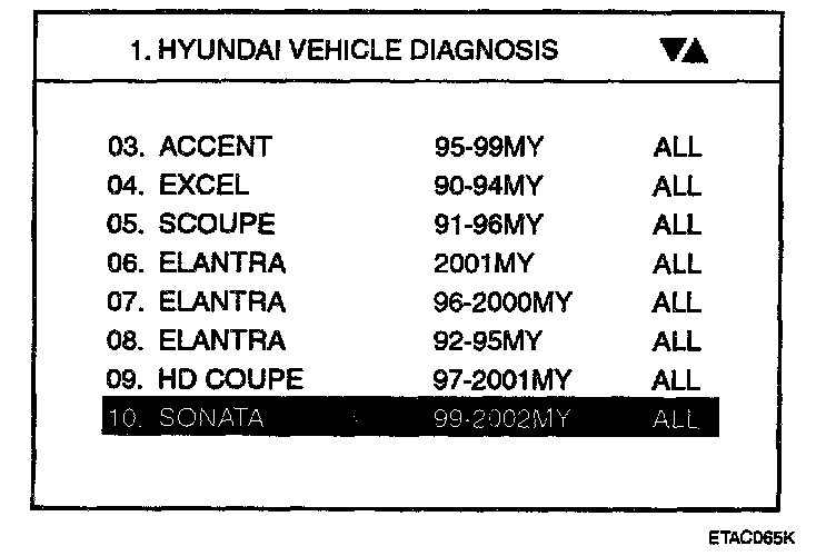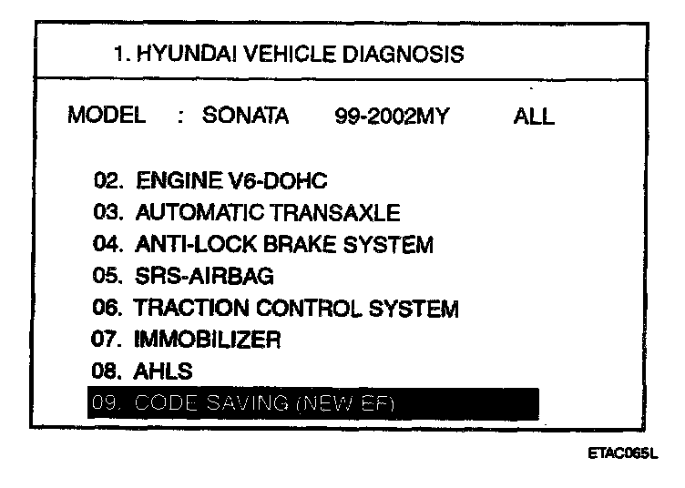 3. Select "10. SONATA" and then do "09. CODE SAVING (NEW EF)".