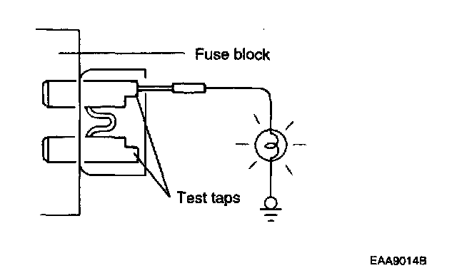 A blade type fuse has test taps provided to allow checking the fuse itself without removing it from the fuse block. The fuse is good if the test lamp lights up when one lead is connected to the test taps (one at a time) and the the lead is grounded. (Turn the ignition switch so that the fuse circuit becomes operative.)