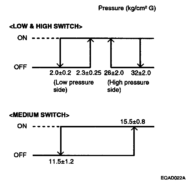 The triple pressure switch is a combination of the low pressure switch (for checking the quantity of refrigerant) and the high pressure switch (for prevention of air conditioning line burst) and medium pressure switch (for cooling fan operation). It is installed in the receiver drier and when the pressure becomes approximately 200 kPa (29 psi) or lower, the compressor stops, thus preventing the compressor from being damaged by sticking. When the pressure reaches 1,800 kPa (261 psi) or higher, the cooling fans run high speed from low speed, thus preventing the power consumption of cooling fans from being discharged. When the pressure reaches 3,241 kPa (470 psi) or higher, the compressor stops, thus preventing air conditioning line burst. There is generally no necessity for inspection; if, however, an unusual condition, such as nonoperation of the compressor is encountered, check by following the given procedures.