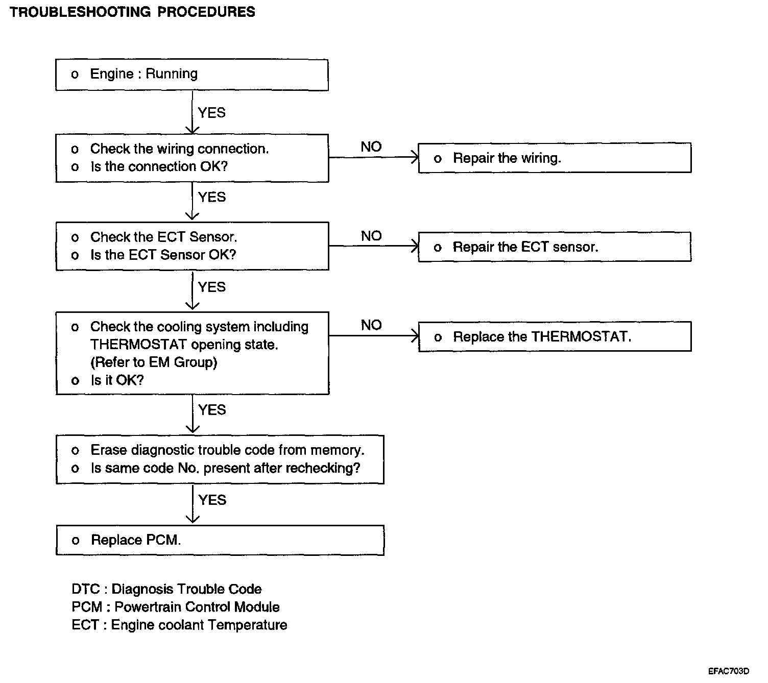 If the fast idle speed is not enough or the engine gives off dark smoke during the engine warm-up operation, the engine coolant temperature sensor might be the cause.