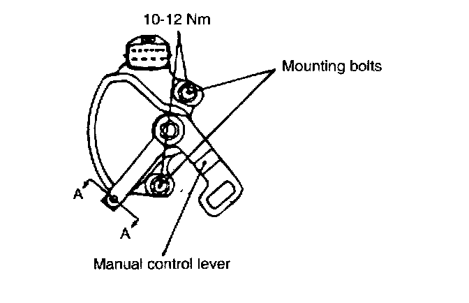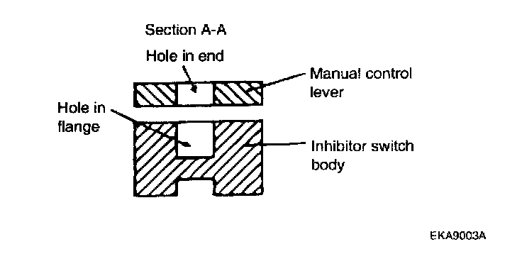 4. Loosen the transaxle range switch body mounting bolts and then turn the transaxle range switch body so the hole in the end of the manual control lever and the hole (cross section A-A in the figure) in the flange of the transaxle range switch body flange are aligned.