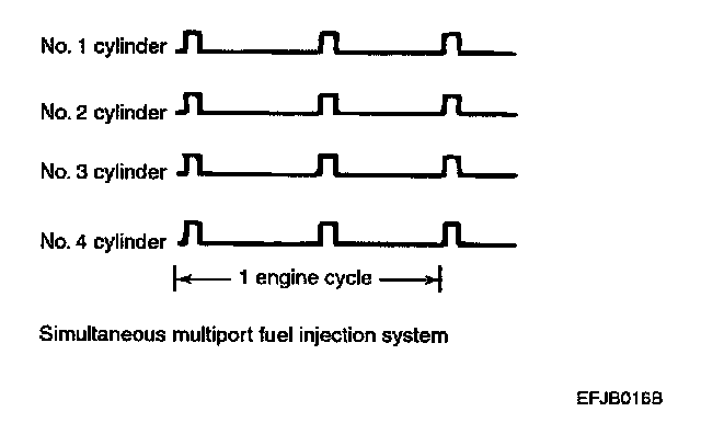 The injector drive times and injector timing are controlled so that the optimum air/fuel mixture is supplied to the engine to correspond to the continually-changing engine operation conditions. A single injector is mounted at the intake port of each cylinder. Fuel is sent under pressure from the fuel tank by the fuel pump with the pressure being regulated by the fuel pressure regulator. The fuel thus regulated is distributed to each of the injectors. This is called multiport. Fuel injection is normally carried out once for each cylinder for every two rotations of the crankshaft. The PCM provides a richer air/fuel mixture by carrying out "open-loop" control when the engine is cold or operating under high load conditions in order to maintain engine performance. In addition, when the engine is warm or operating under normal conditions, the PCM controls the air/fuel mixture by using the heated oxygen sensor signal to carry out "closed-loop" control in order to obtain the theoretical air/fuel mixture ratio that provides the maximum cleaning performance from the three way catalyst.
