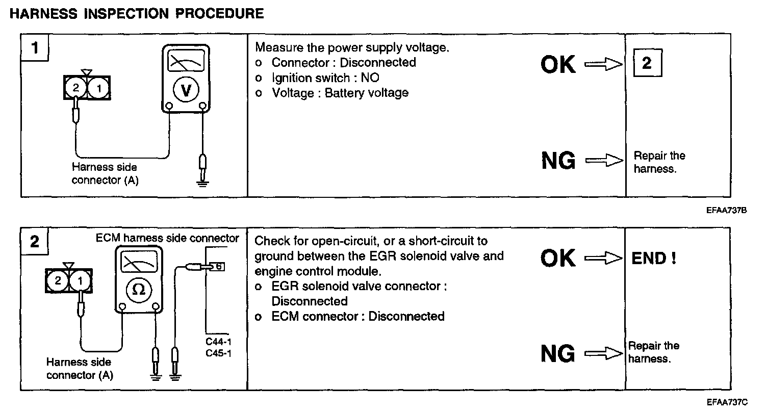 If the results of EGR solenoid valve on-vehicle and off-vehicle inspections are normal, but the diagnostic trouble code for EGR system failure is displayed, check the EGR valve, vacuum hose and EGR passage for blocking.