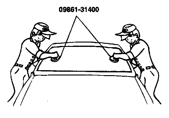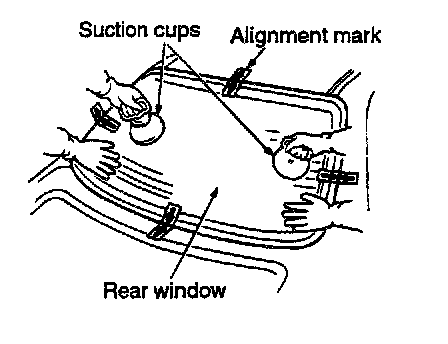 11. Using the suction cups, or the special tool (09861 - 31400), hold the rear window over the opening to align it with the alignment marks and set it down on the adhesive. Lightly push on the rear window until its edges are fully seated on the adhesive all the way around.