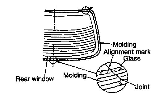 5. Set the rear window, then center it in the opening. Make alignment marks across the rear window and body with a grease pencil at the four points shown.
