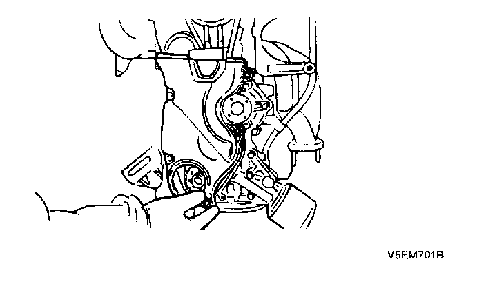 NOTE: If the timing belt is reused, make an arrow indicating the turning direction (or the front of the engine) to make sure that the belt is reinstalled in the same direction as before.