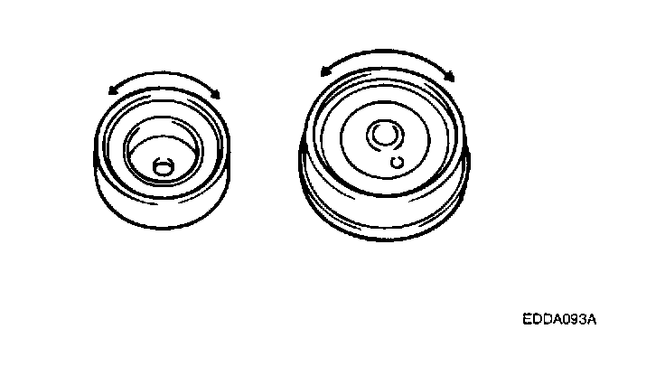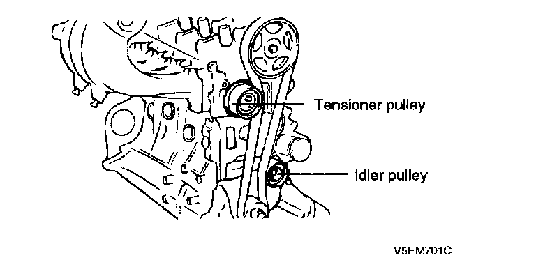 2. Inspect the tensioner pulley and the idler pulley for easy and smooth rotation and check for play or noise. Replace as necessary.