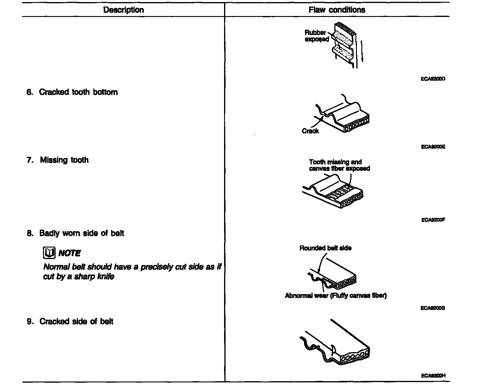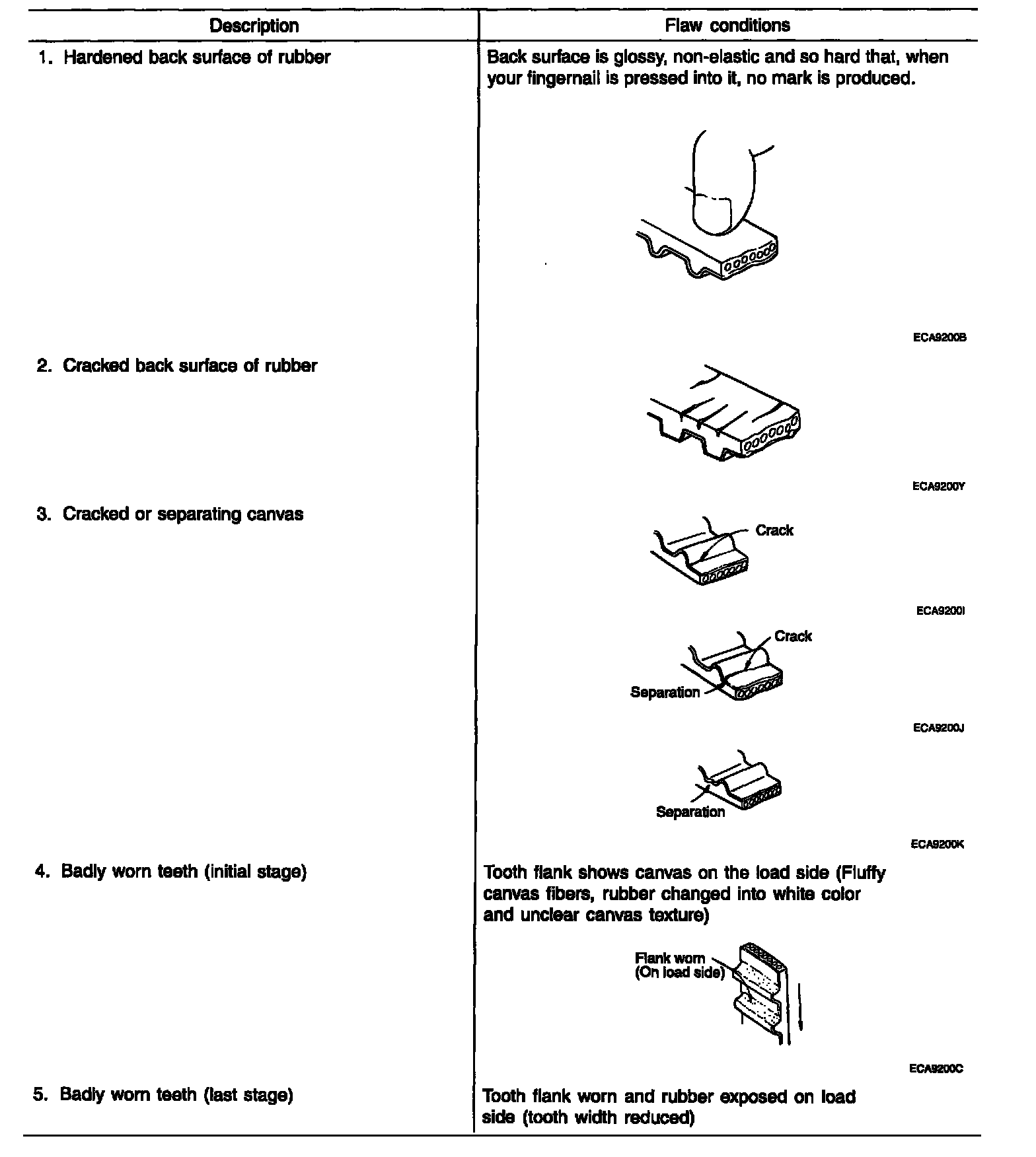 2. When the engine is overhauled or belt tension adjusted, check the belt carefully. If any of the following flaws are evident, replace the belt.