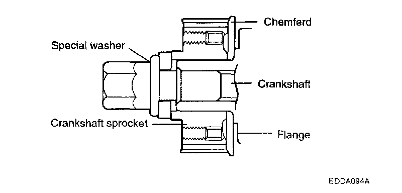 1. Install damper pulley flange and crankshaft sprocket as shown. Pay close attention to their mounting direction.