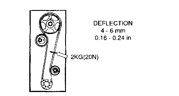 7. Recheck the belt tension. When the tension side of timing belt is pushed horizontally with a moderate force [approximately 2kg (20N, 51b)], the timing belt cog end sags in approximately 4-6 mm (0.16 - 0.24 inch).
