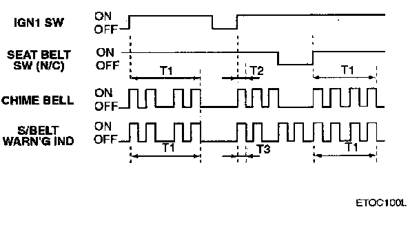 Whenever the ignition 1 is turned on the seat belt warning chime is sounded for total time 6 seconds, with period 0.9 sec and duty rate 50%. It is silenced immediately if the seat belt is sensed as fastened.