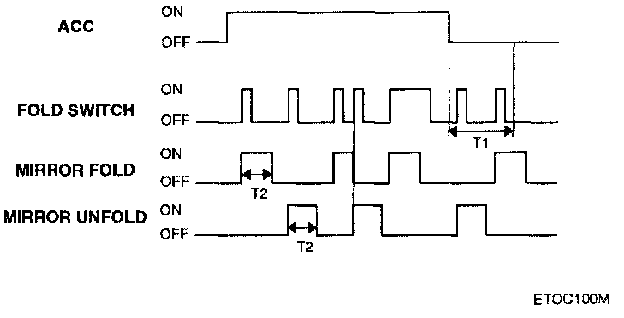 If the folding mirror switch is pressed within 30 seconds after the ACC signal is removed, the mirror outputs (folding or unfolding) will operate for 16±6 sec. If during the mirror operation, the folding mirror switch is pressed again then the opposite operation will commence again. If after the ACC signal is removed, the folding mirror switch is repressed within the 16±6 sec, the mirror outputs will operate for a further 16±6 sec.
