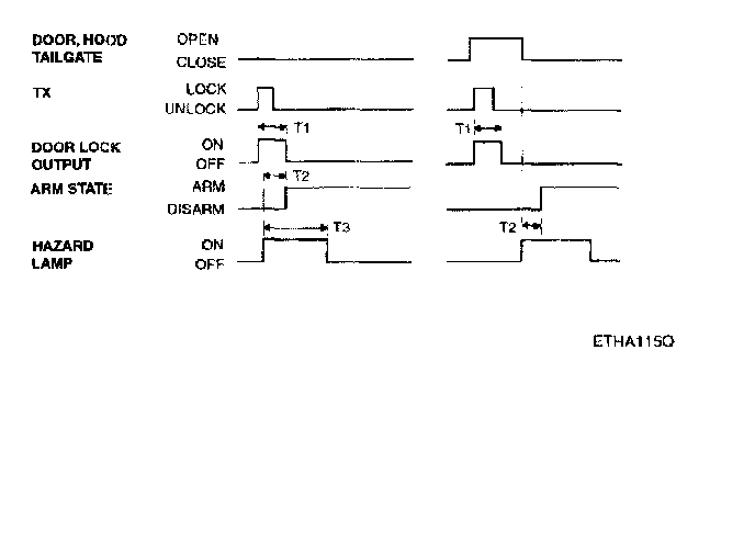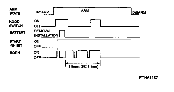 This system enters the armed state if it is in the pro- armed state and, after 0.6 sec, check actuator lock and each door, hood and tail gate close, and no door warning switch (no key in ignition).