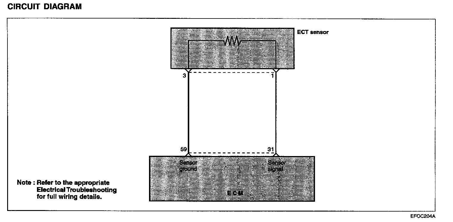 The engine coolant temperature sensor, located in the engine coolant passage of the cylinder head. It detects the engine coolant temperature and relays signals to the ECM. It employs a thermistor which is sensitive to changes in temperature. The electric resistance of a thermistor decreases in response to temperature rise. The ECM judges engine coolant temperature by the sensor output voltage and provides optimum fuel enrichment when the engine is cold.
