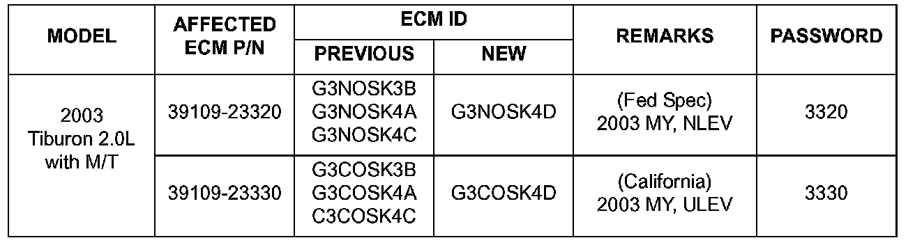 ^ Model: 2003 TIBURON vehicles with 2.0L engines and manual transaxles