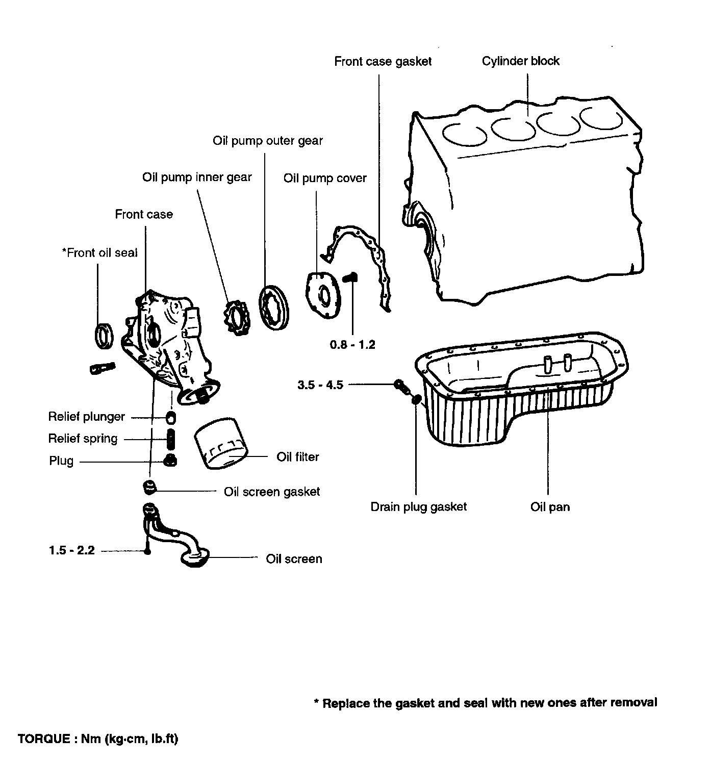 Oil pan bolt:......10 - 12 Nm (100 - 120 kg.cm, 7 - 9 ft. lbs.)