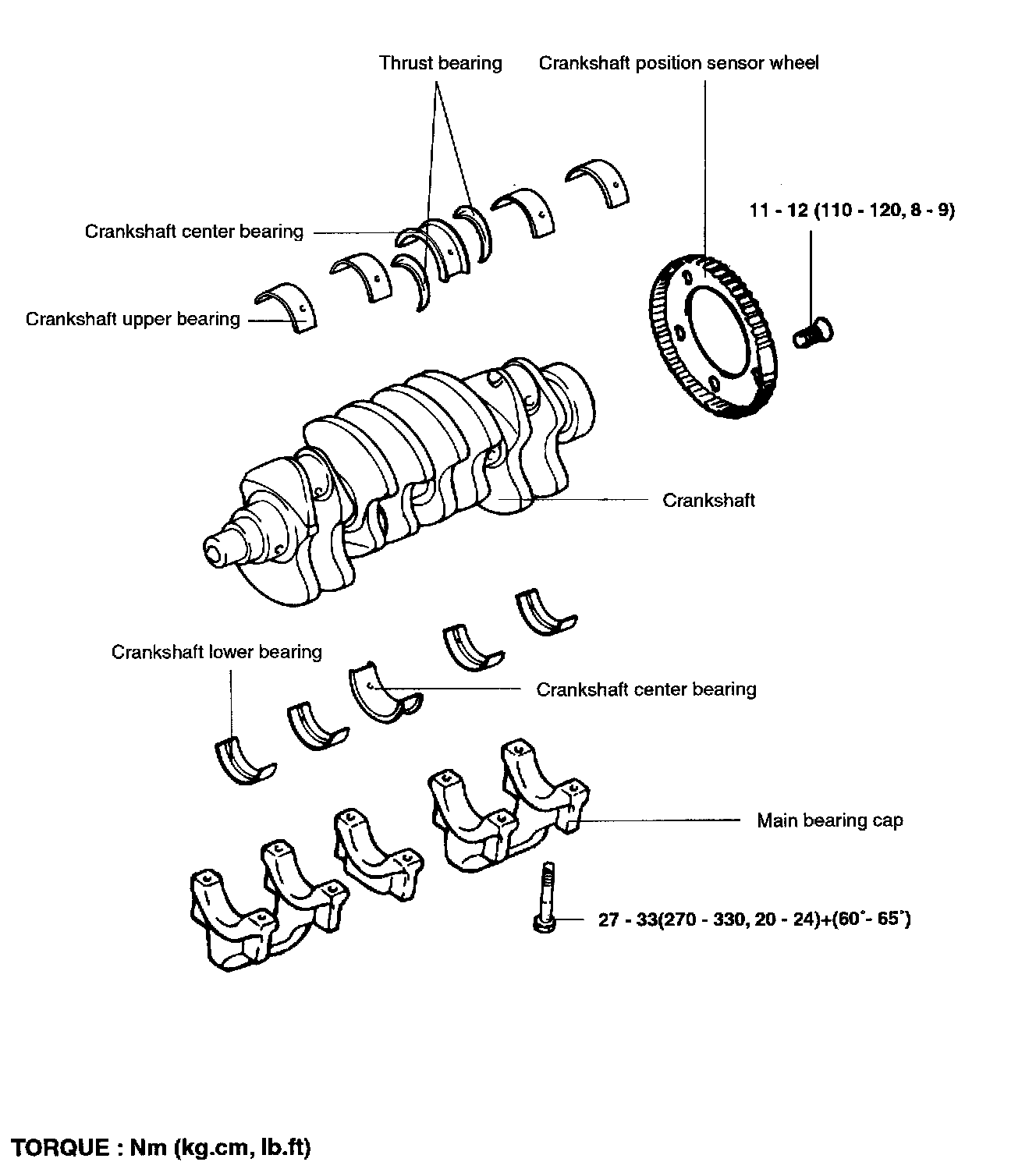 Main bearing cap bolt: ........27 - 33 Nm (270 - 330 kg.cm, 20 - 24 ft. lbs.) + (60° - 65°)