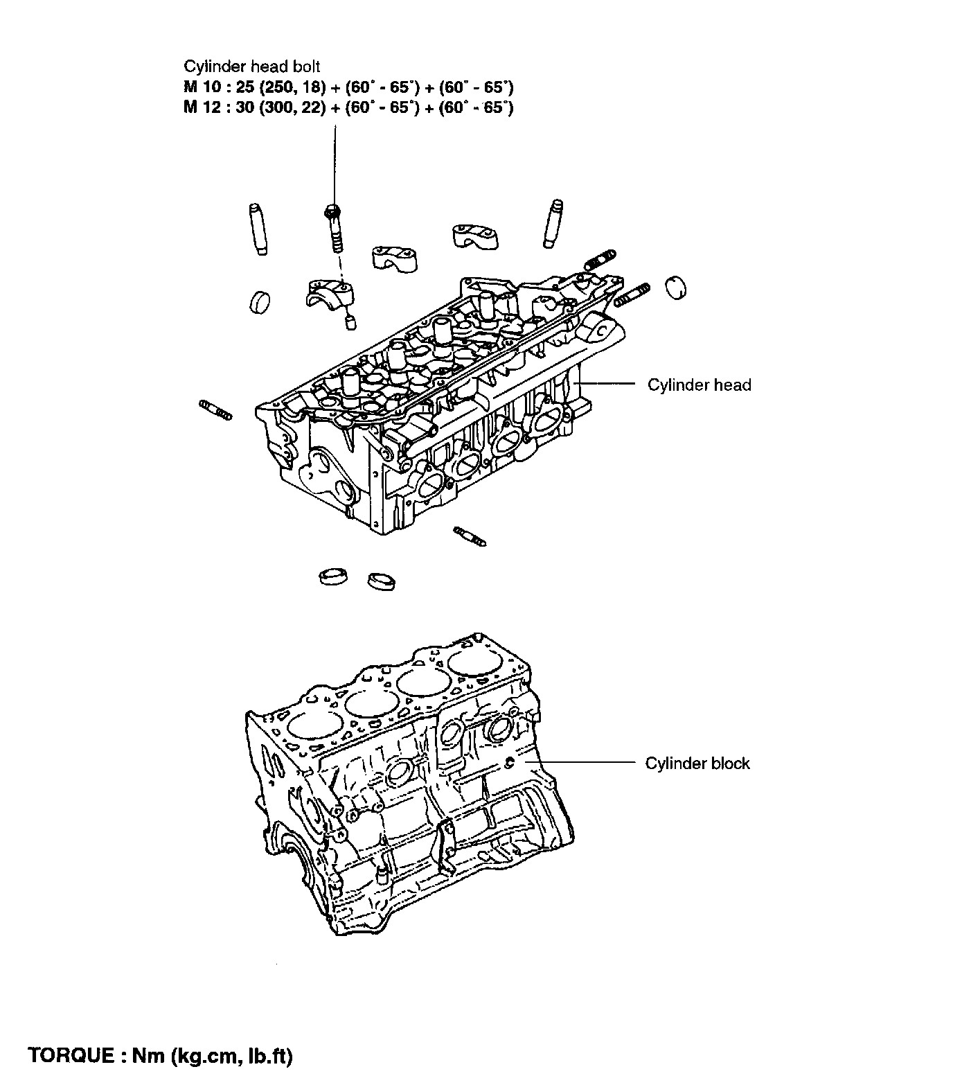 Cylinder head bolts - M10; 25+(60-°65°)+(60°-65°) Nm (250+[60°-65°] +[60°-65°] kg-cm, 18+[60°-65°]+[60°-65°] ft. lbs.)