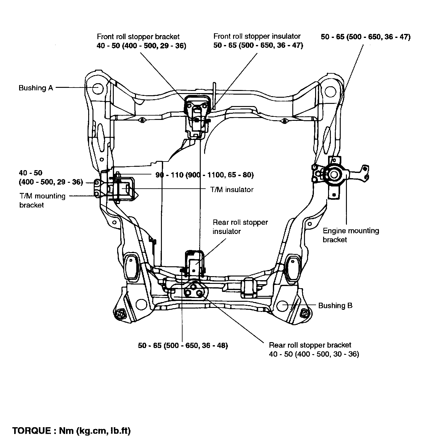 Front roll stopper insulator nut:..........50-65 Nm (500-650 kg-cm, 36-48 ft. lbs.)